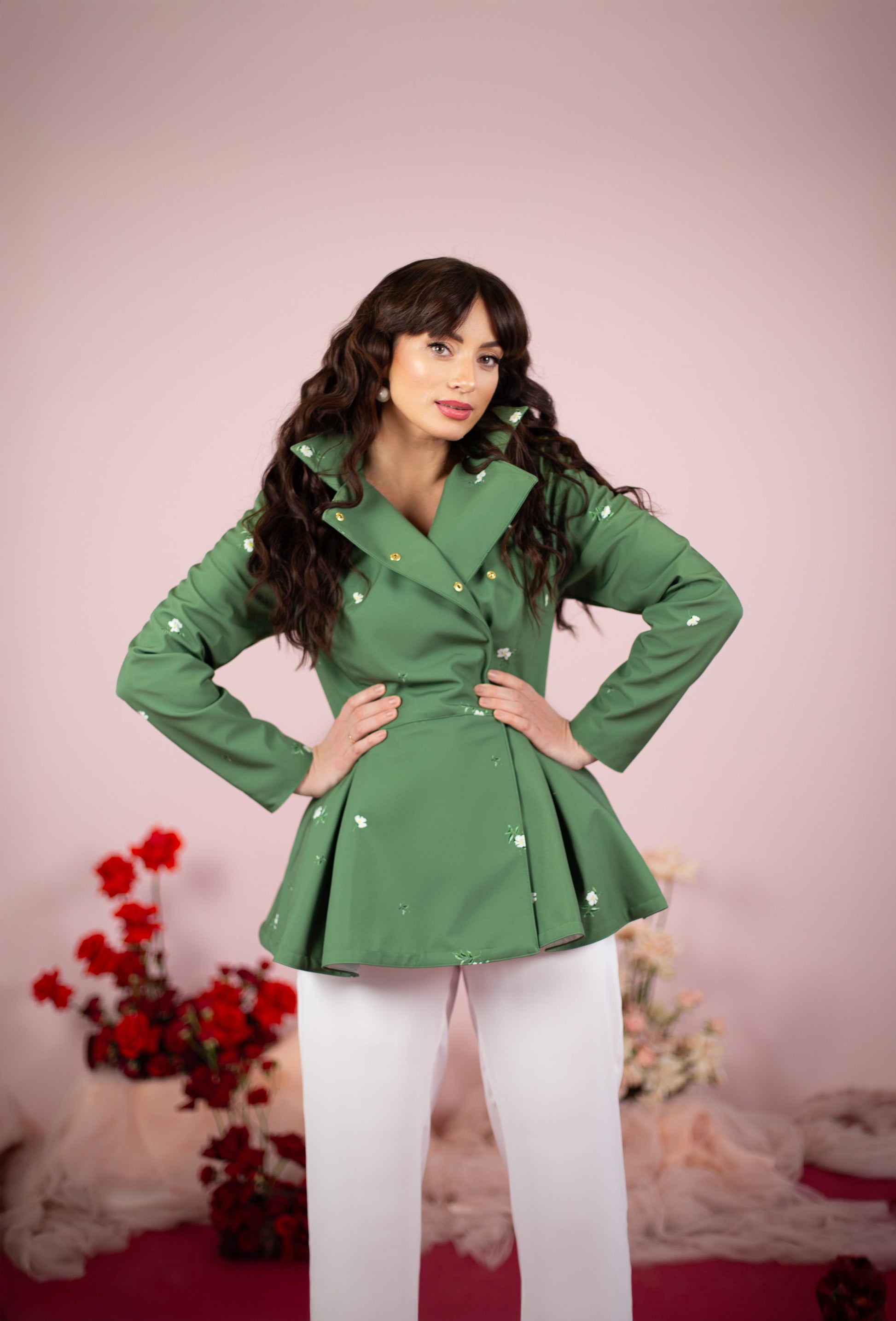 This double-breasted style coat in fresh green color is adorned with a delicate white floral print that captures the beauty of blooming gardens. The detachable hood offers flexibility for changing weather, while the water-resistant fabric keeps you dry during unexpected drizzles. Lined with luxurious satin in light mint, this coat adds a charming feel wherever you go.