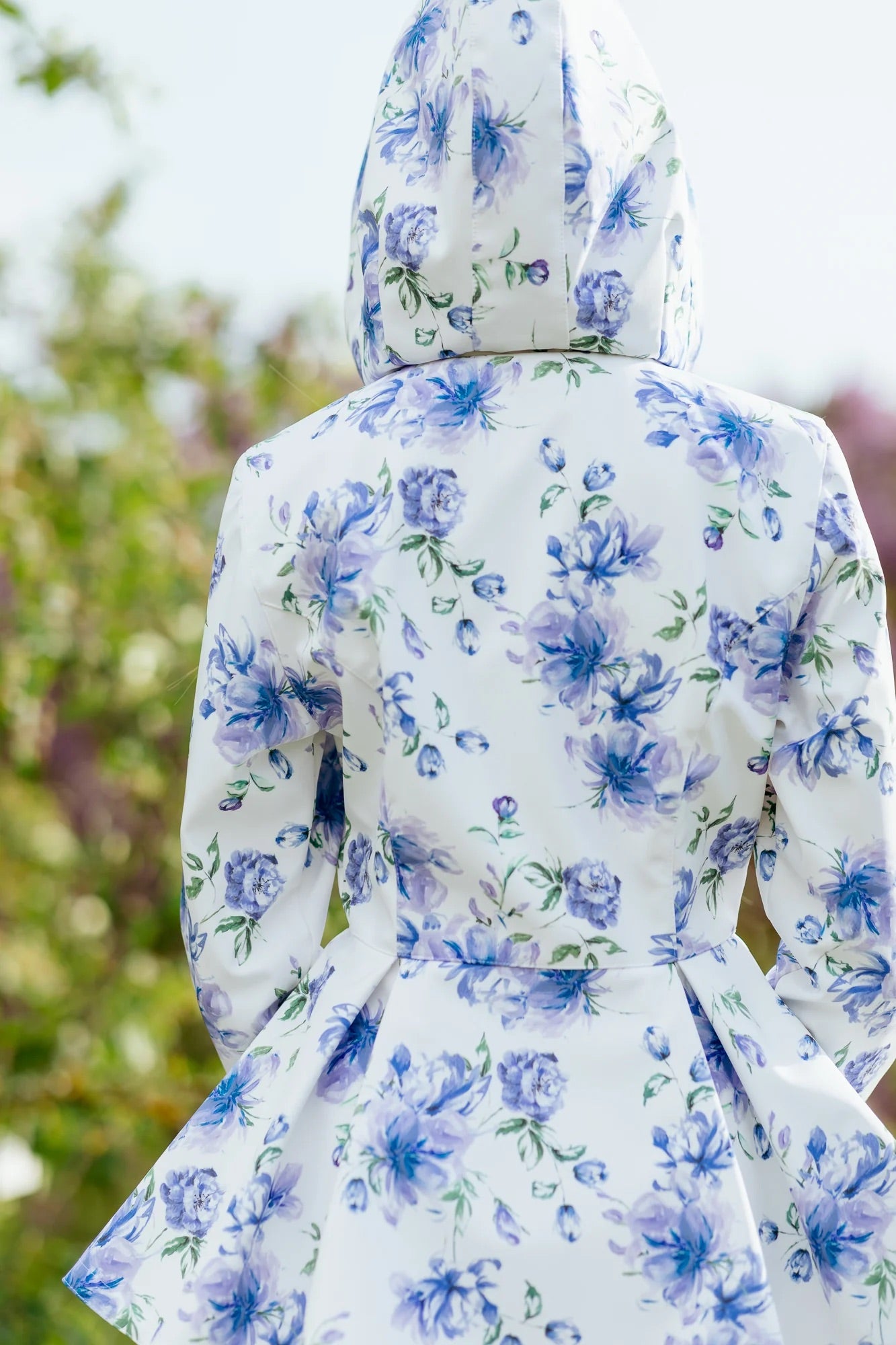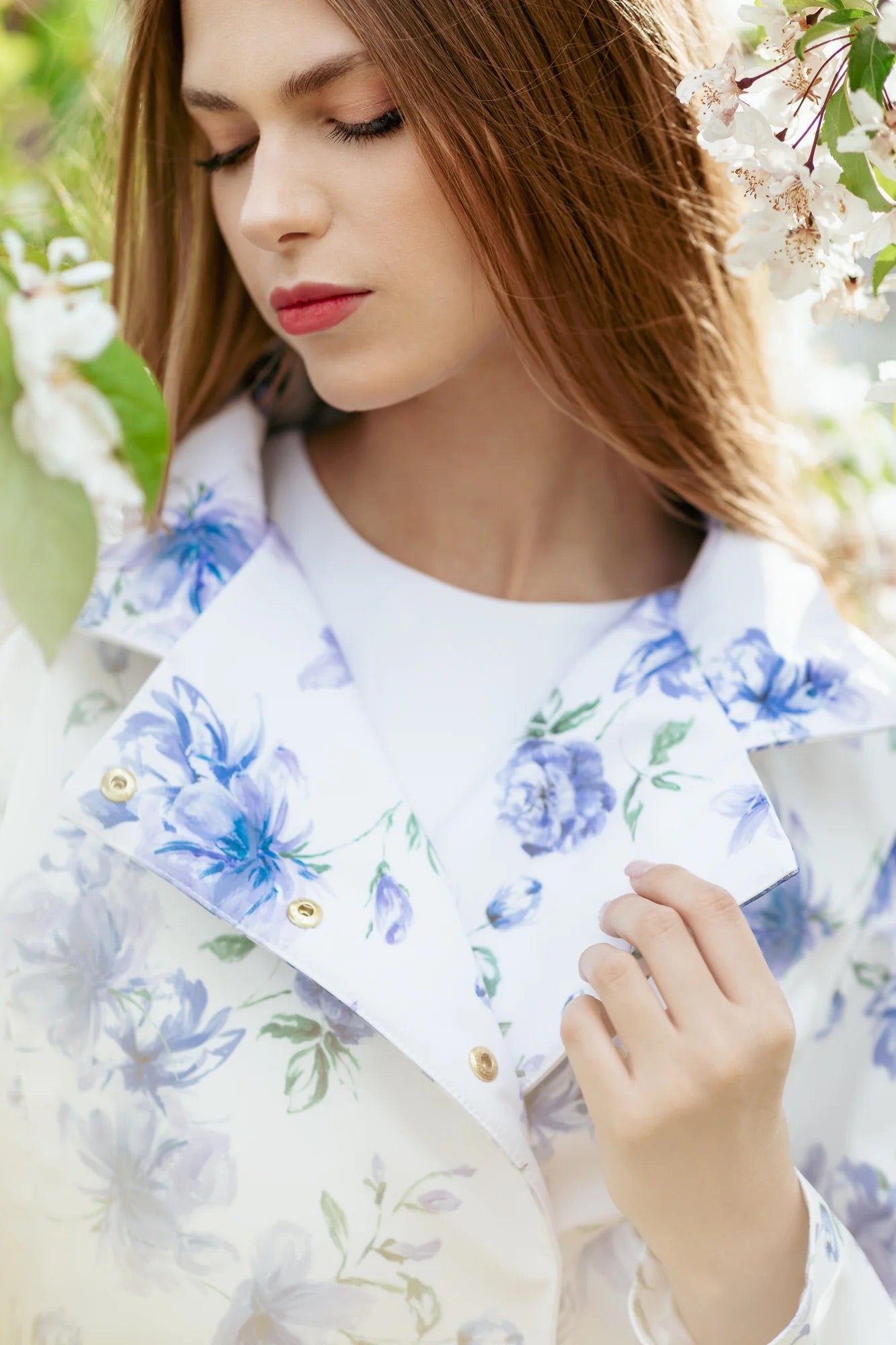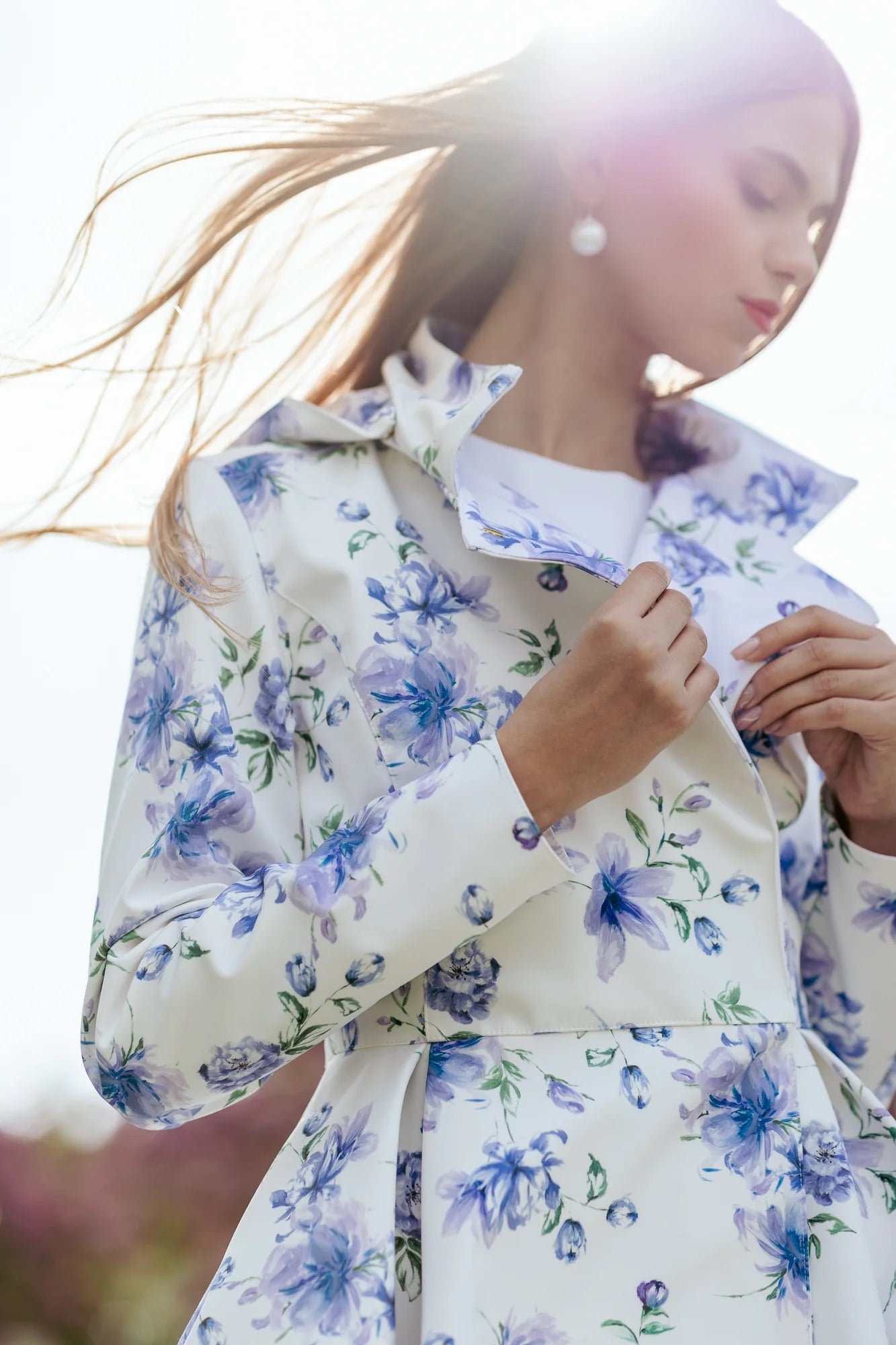 Denne korte jakken har en iøynefallende hvit base prydet med et vakkert blomstermønster i blånyanser og grønne blader. Designet kompletteres med et elegant og komfortabelt hvitt satin-fôr fra Italia, som sørger for at du holder deg varm under alle forhold. Jakken inkluderer en avtakbar hette - enkelt løsbar med trykknapper, som gjør den perfekt for værforandringer. Omfavn eleganse og praktisk funksjonalitet med denne fantastiske, vannavstøtende jakken. Legg til et preg av naturinspirert blomsterpryd i garderoben din.