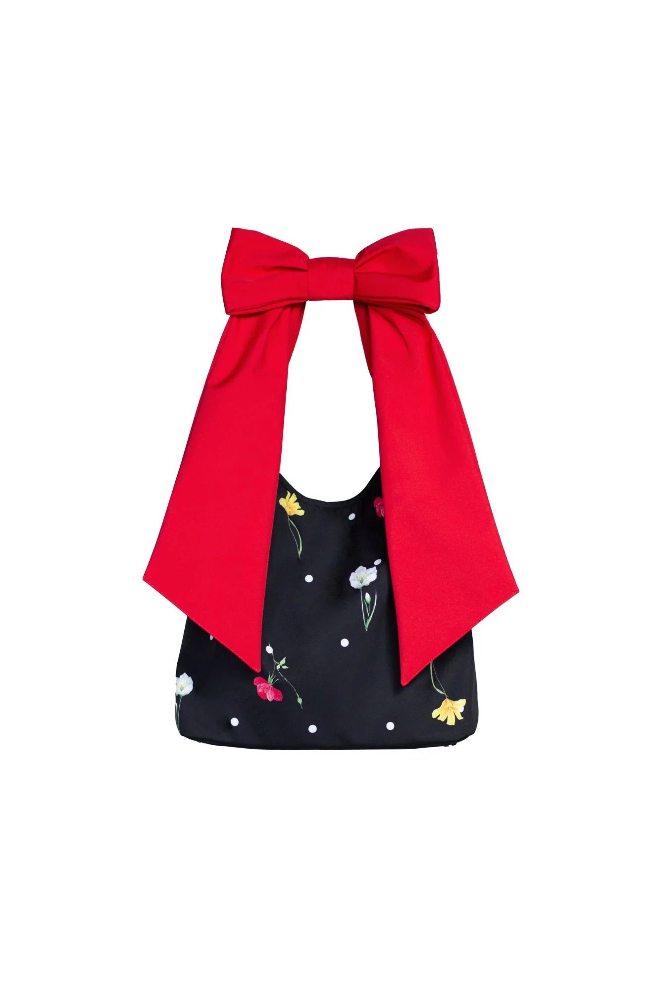 Denne svarte vesken er dekket av et lite, fargerikt blomstertrykk som gir et muntert preg til antrekket ditt. De svarte stroppene er knyttet i en sløyfe, noe som gir vesken en søt og stilig følelse. Den er romslig nok til hverdagsbruk og gjør ethvert antrekk mer lekent og pent.