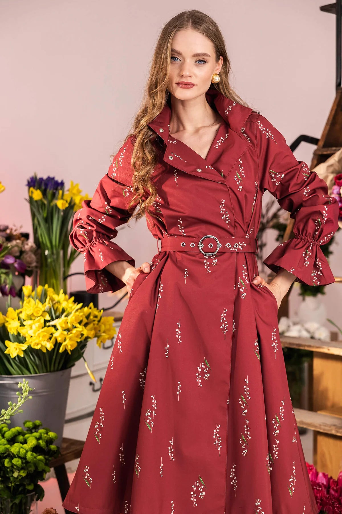 En dobbeltspent trenchcoat i burgunder farge for kvinner med liljekonvall-trykk, folder foran, mykt rosa italiensk satengfôr og et matchende belte. De litt utvidede, rynkede ermene skaper en voluminøs form med elegante rysjer.