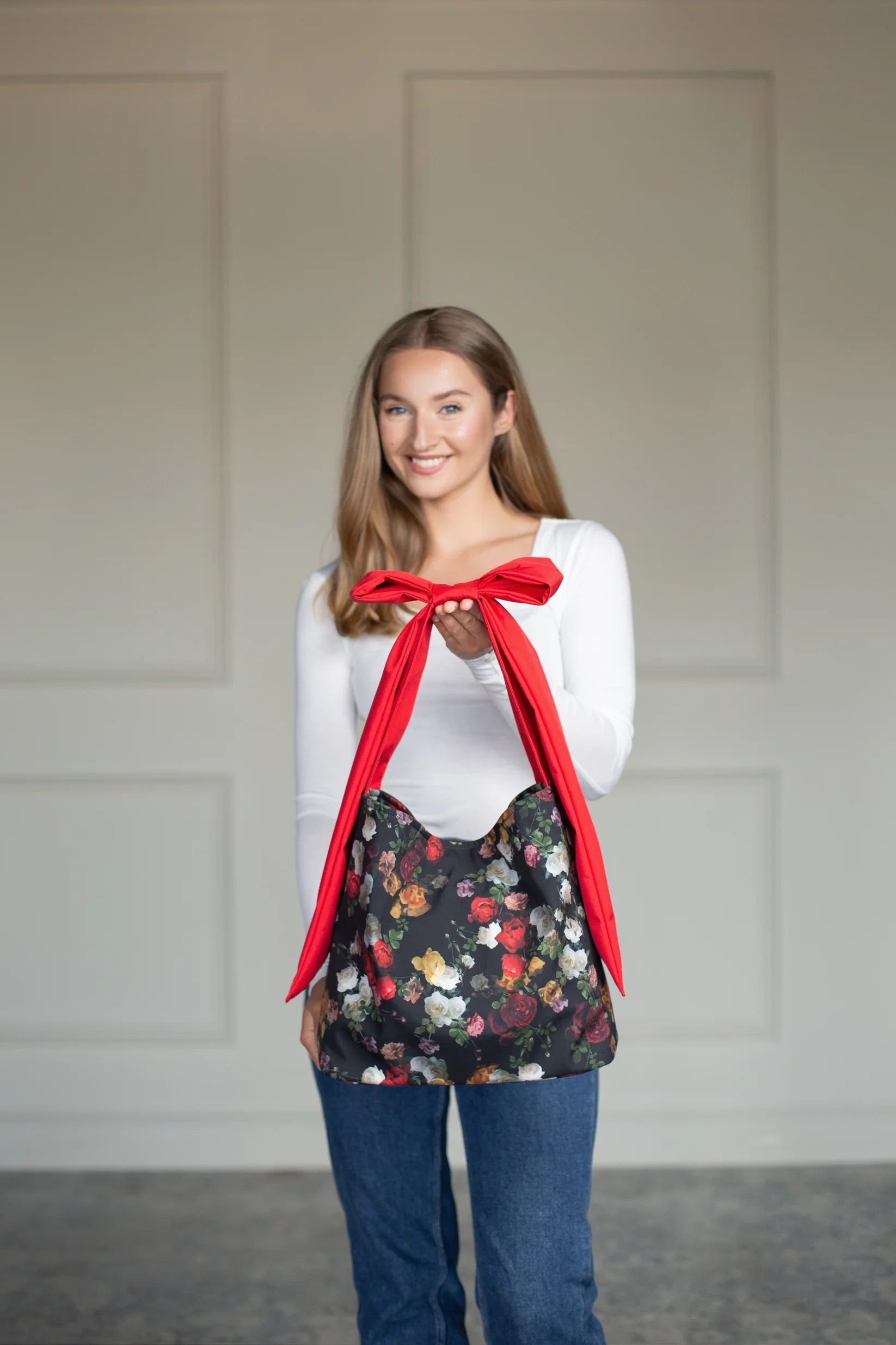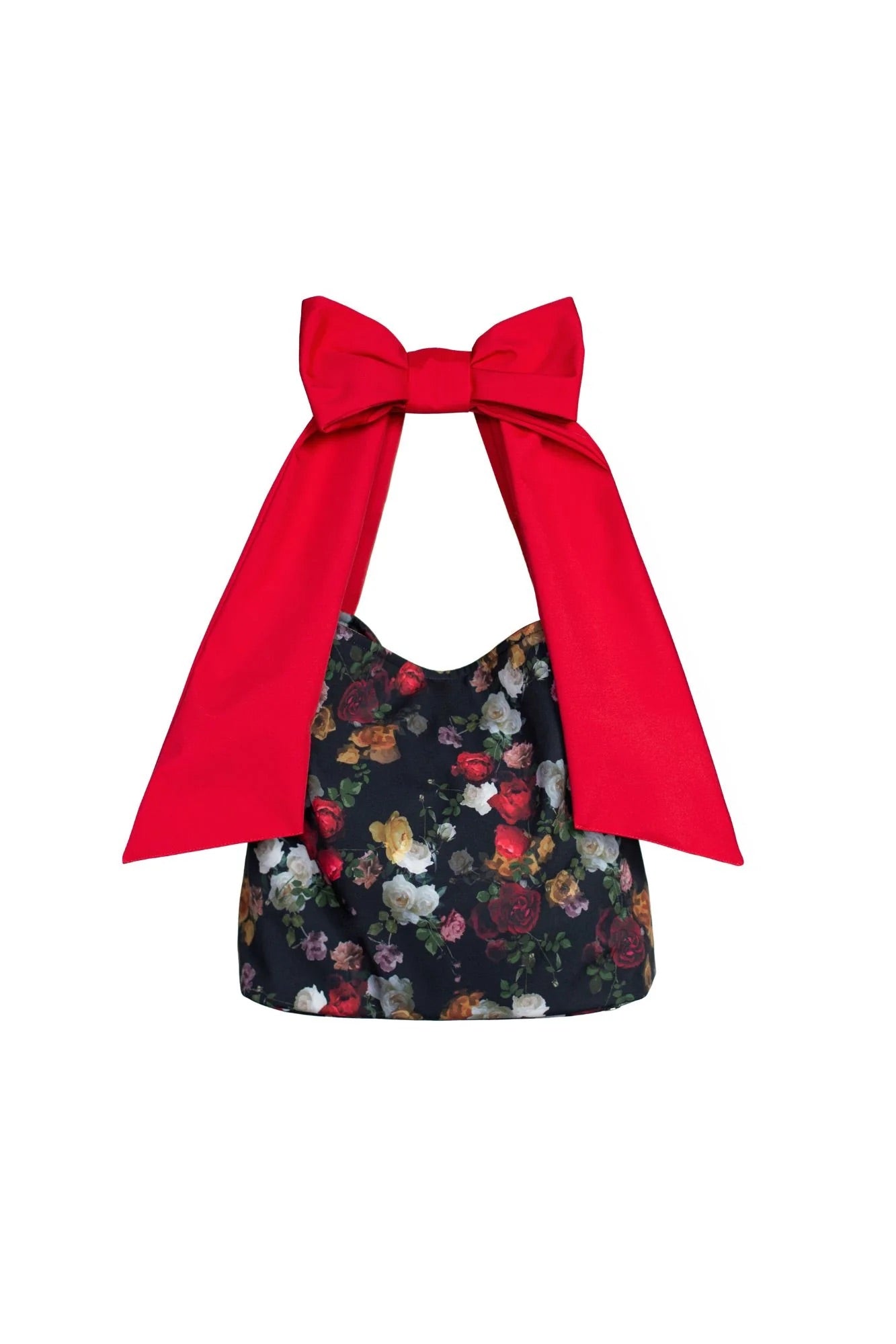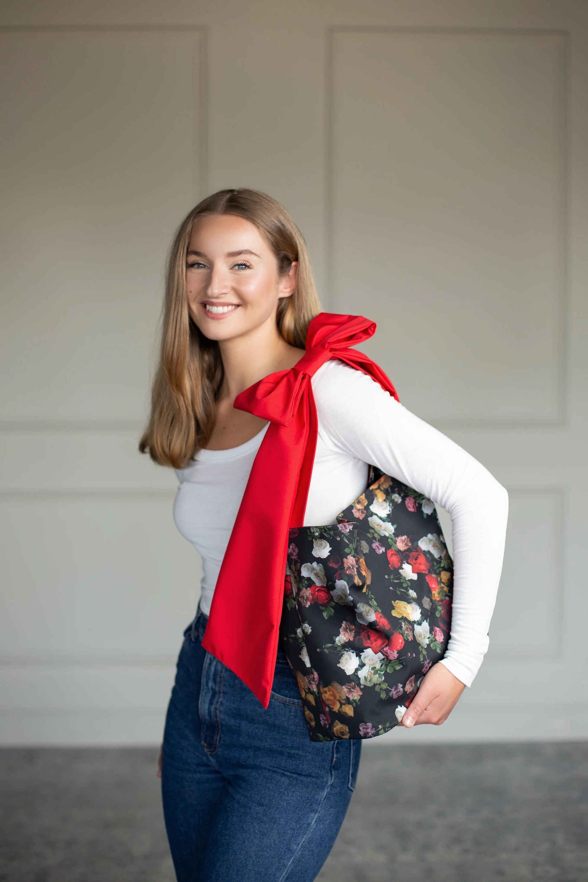 Romantisk og dristig – «Darling Rose»-totevesken med sløyfe. Denne svarte totevesken med sløyfe har et vakkert fargerikt rosetrykk, kombinert med en livlig rød stropp knyttet som en sløyfe. Det livlige blomsterdesignet gir et snev av eleganse og sjarm, mens den røde stroppen gir et dristig, iøynefallende preg. Perfekt for hverdagsbruk eller spesielle anledninger.