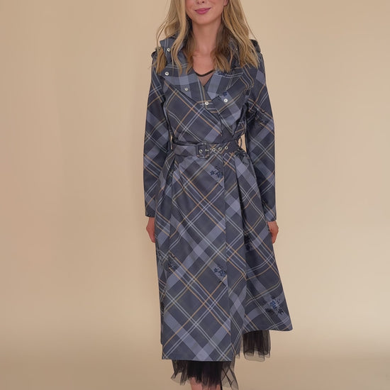 «Duchess in Blue» er en kåpe laget for selvtillit og eleganse. Den gråblå fargen føles rolig og kongelig – en nyanse som stille skiller seg ut i ethvert miljø. Et rutete mønster og små blå blomster som glir inn i designet, gir et delikat og unikt preg. Kåpestilen har folder foran i skjørtet, noe som gir en myk form. Beltet i midjen flatterer figuren din og gir balanse til kåpens strukturerte utseende. Den kommer også med en avtakbar hette, som gir deg friheten til å justere stilen din når været skifter. Den er vannavstøtende og lett nok til hverdagsbruk – men likevel elegant nok til spesielle øyeblikk. «Duchess in Blue»-kåpen er et plagg du vil føle deg stolt av å bruke, sesong etter sesong.