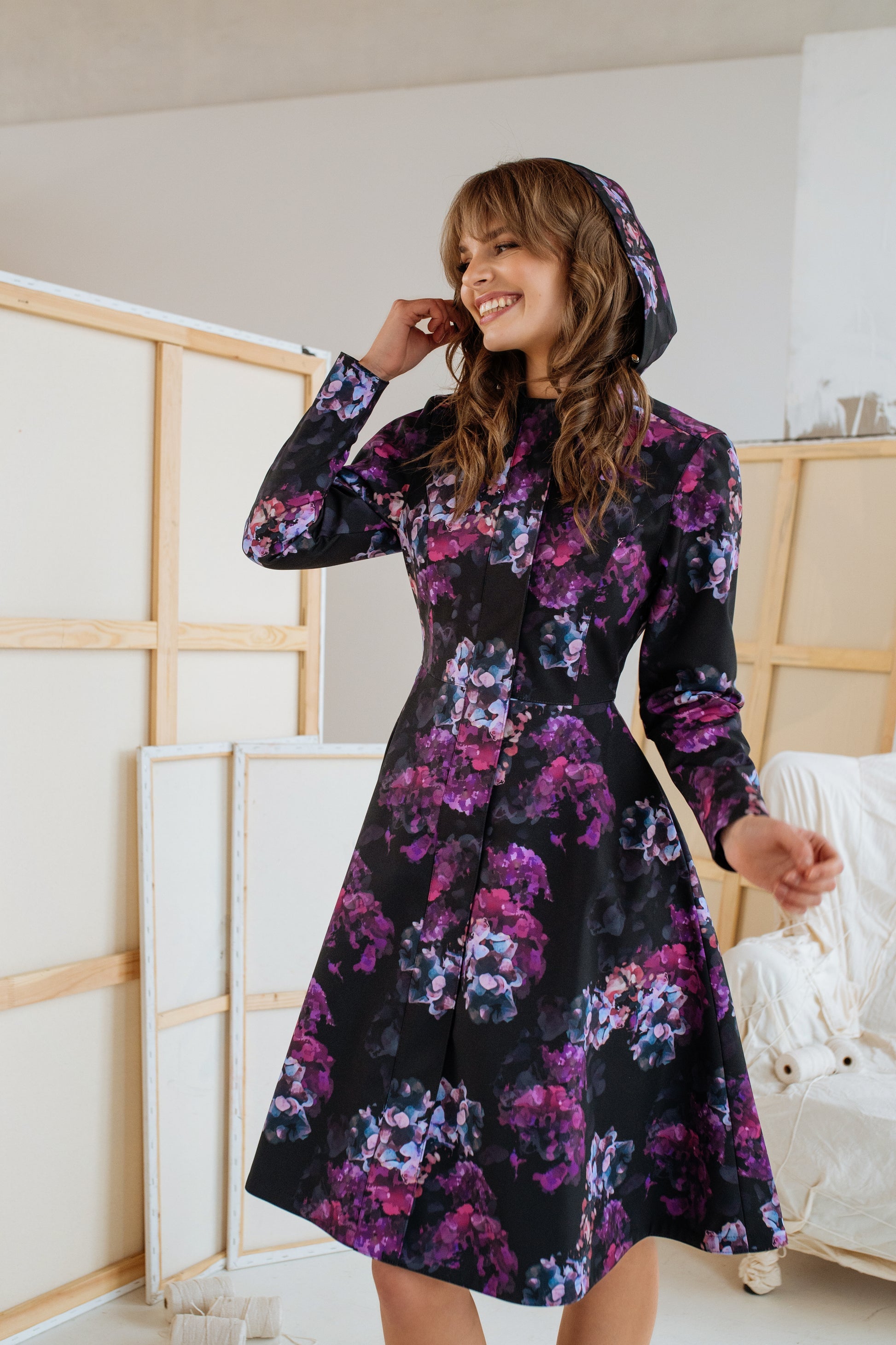 «Hortense»-kåpen er et elegant og lekent mesterverk med sitt passformede og vide design. Den tettsittende toppen går elegant over i et vidt skjørt, noe som skaper en flatterende silhuett. Det livlige lilla og rosa blomstertrykket gir et fargeutbrudd, noe som gjør denne frakken til et stilig og livlig valg for enhver anledning.