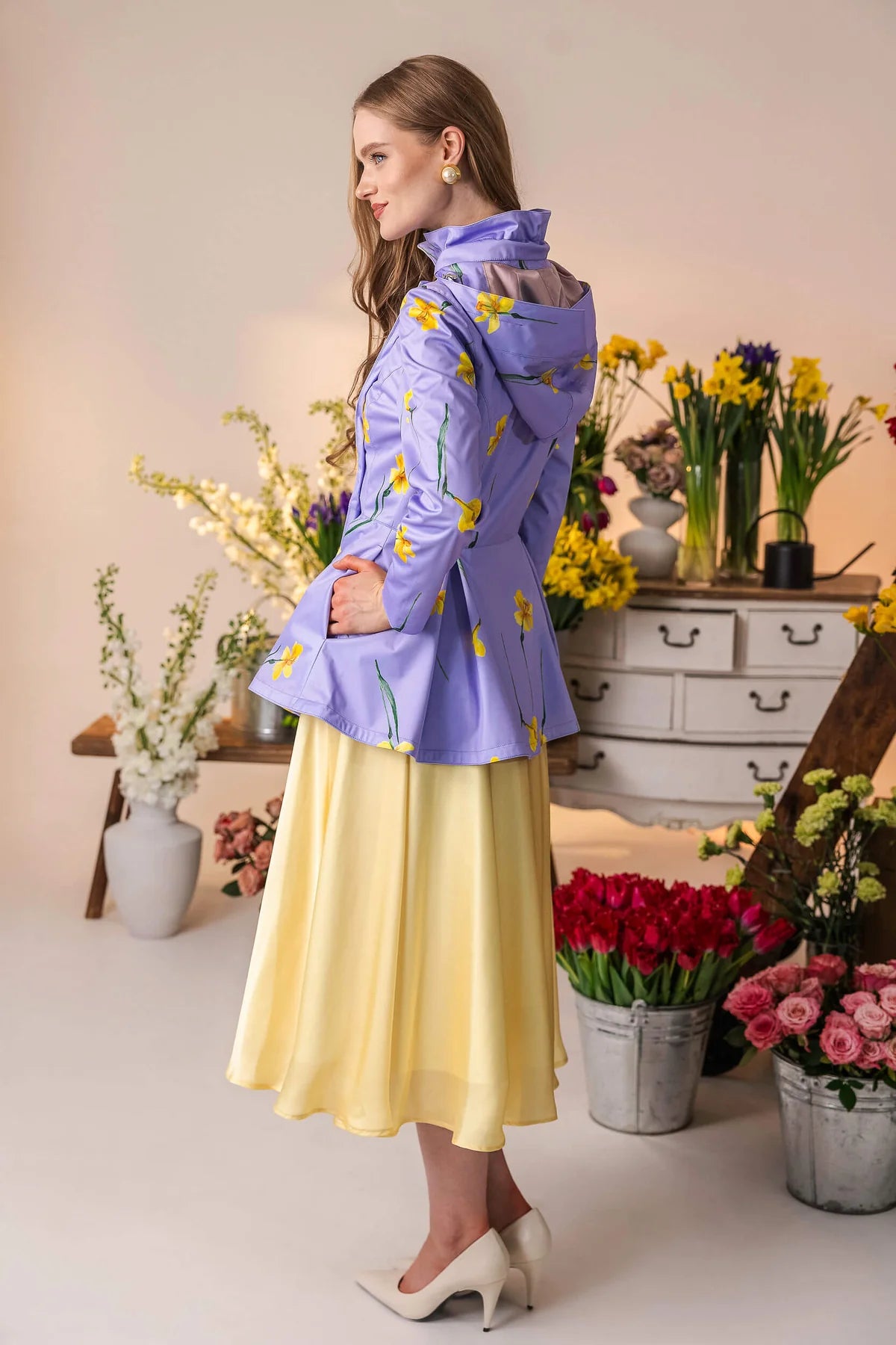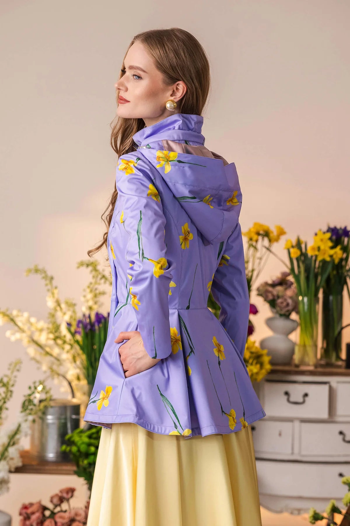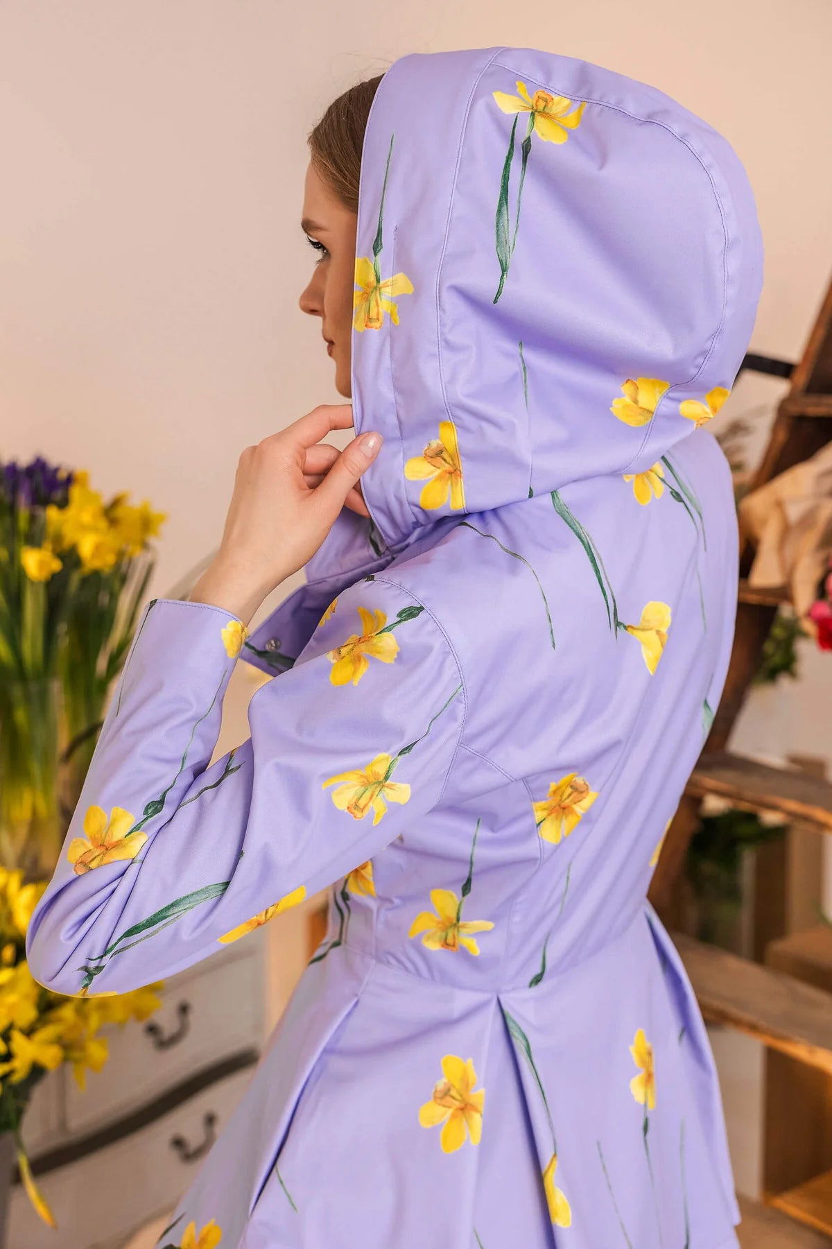 Kåpene lukkes med trykknapper, som er skjult inni den dobbeltsydde knappestolpen. Dette betyr at selv når du må knappe igjen for å holde regnet ute, vil du fortsatt opprettholde de stilige linjene i det elegante snittet uten humper eller bulker noe sted! - Unike stofftrykk som er designet av RainSisters-teamet.