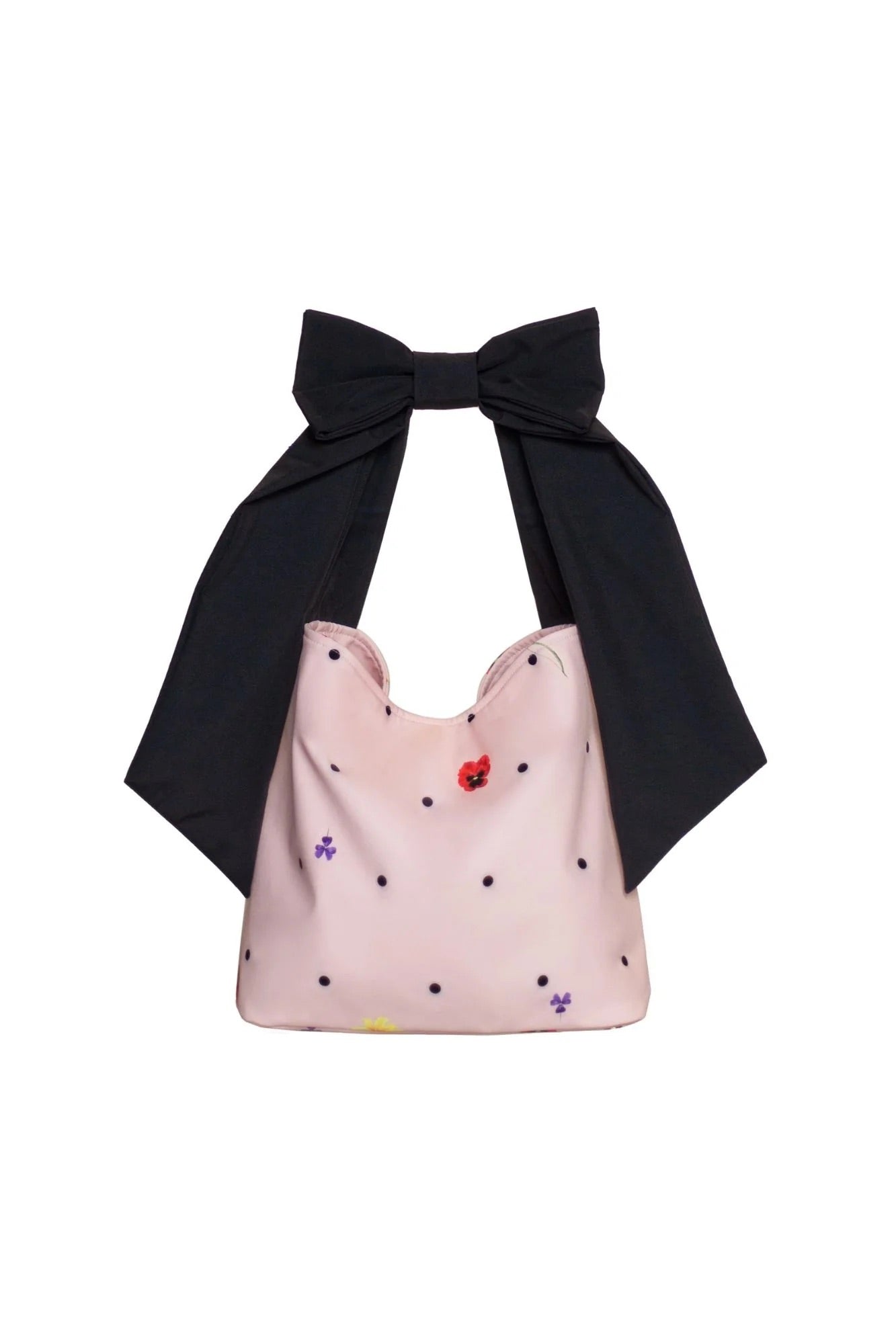 Denne stilige sløyfevesken har en mykrosa base utsmykket med et livlig gult, lilla og rødt blomstertrykk, fremhevet av lekne svarte polkaprikker. Den praktiske størrelsen gjør den perfekt for å bære dine viktigste ting – enten du er ute og handler eller drar på en weekendtur. Den lekne sløyfen på skulderstroppen gir et sjarmerende og elegant preg.