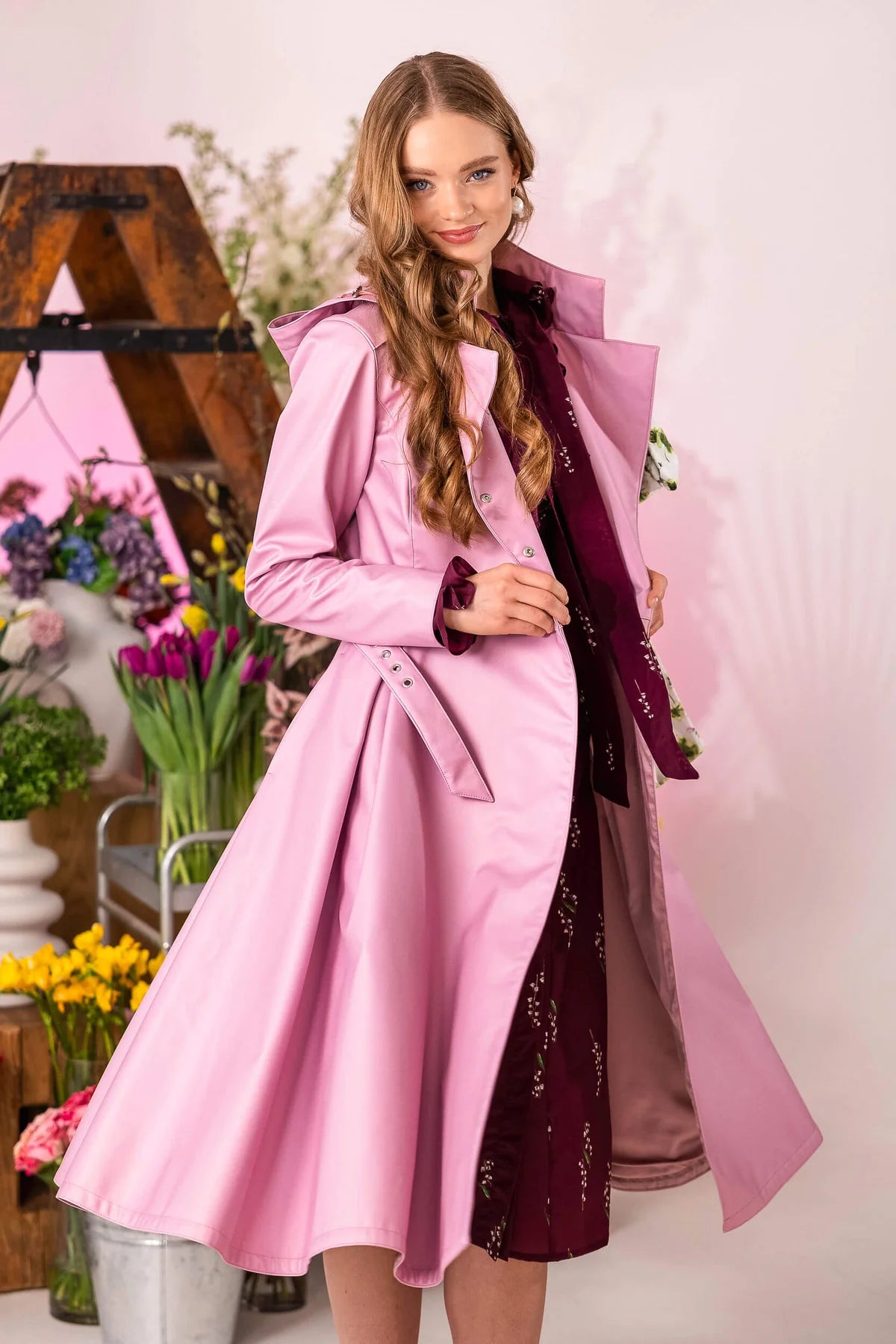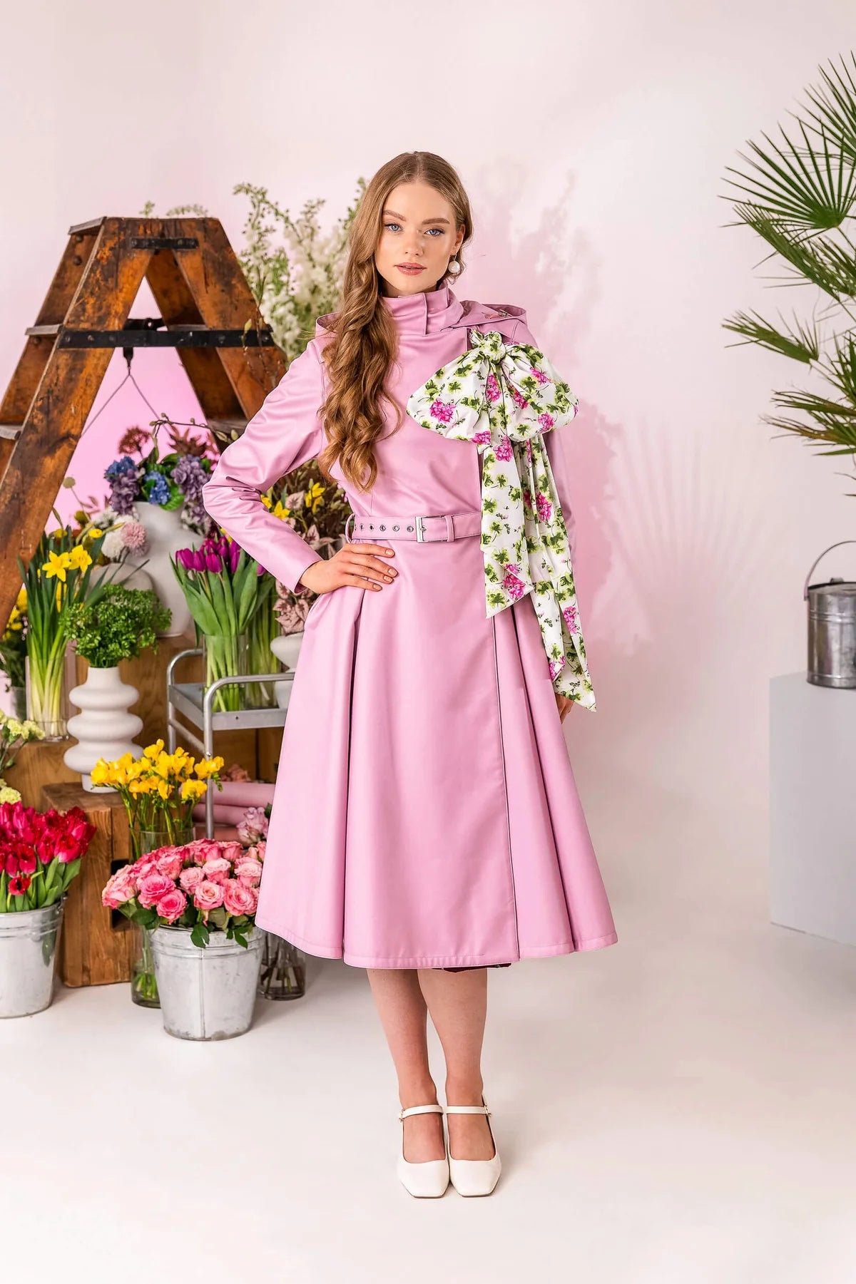 En dobbeltspent kåpe i myk rosa med matchende belte og et avtakbart blomstrete skjerf som kan brukes som sløyfe, belte, skjerf eller dekorativt element. Fôret med myk rosa italiensk sateng gir den komfort og eleganse.