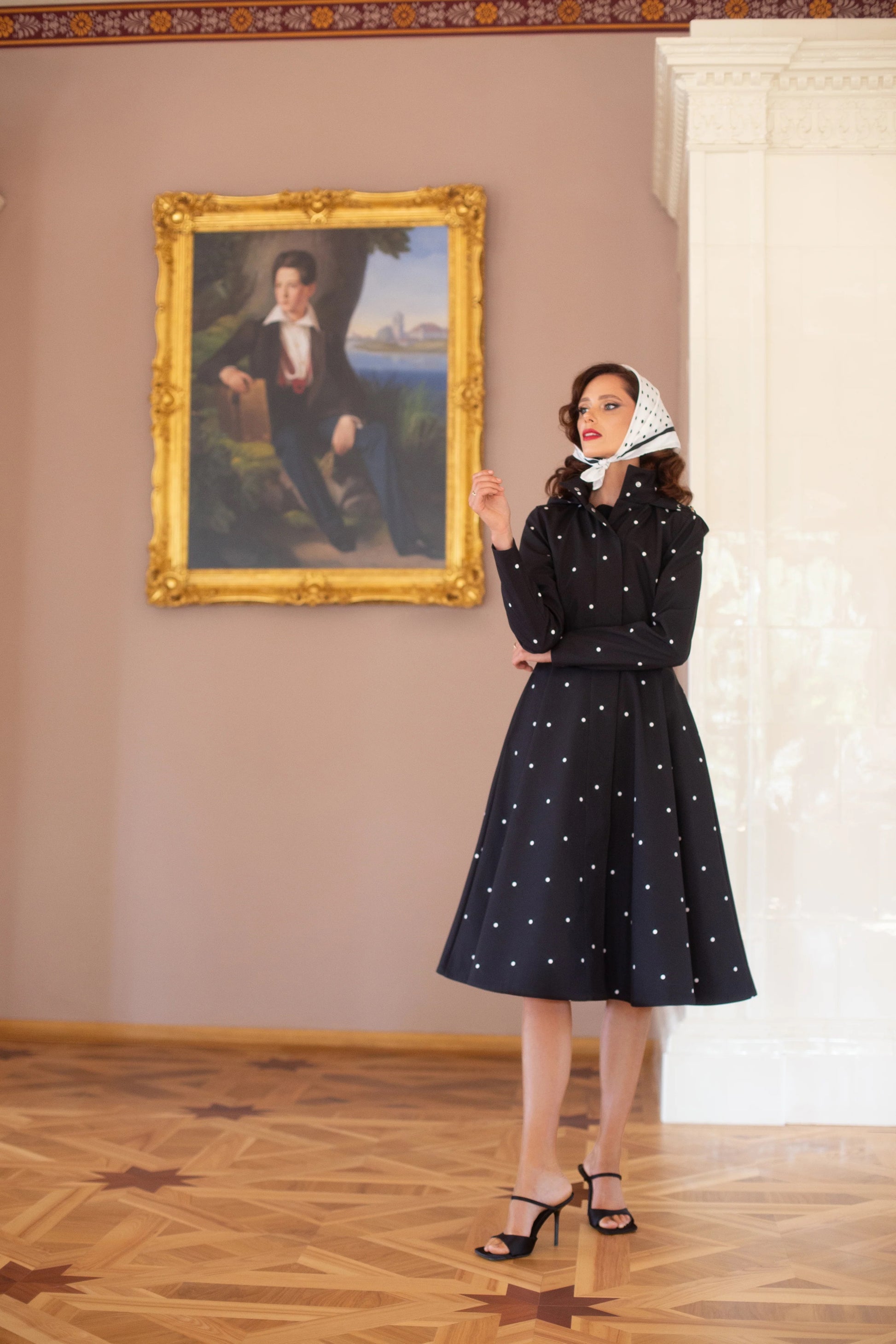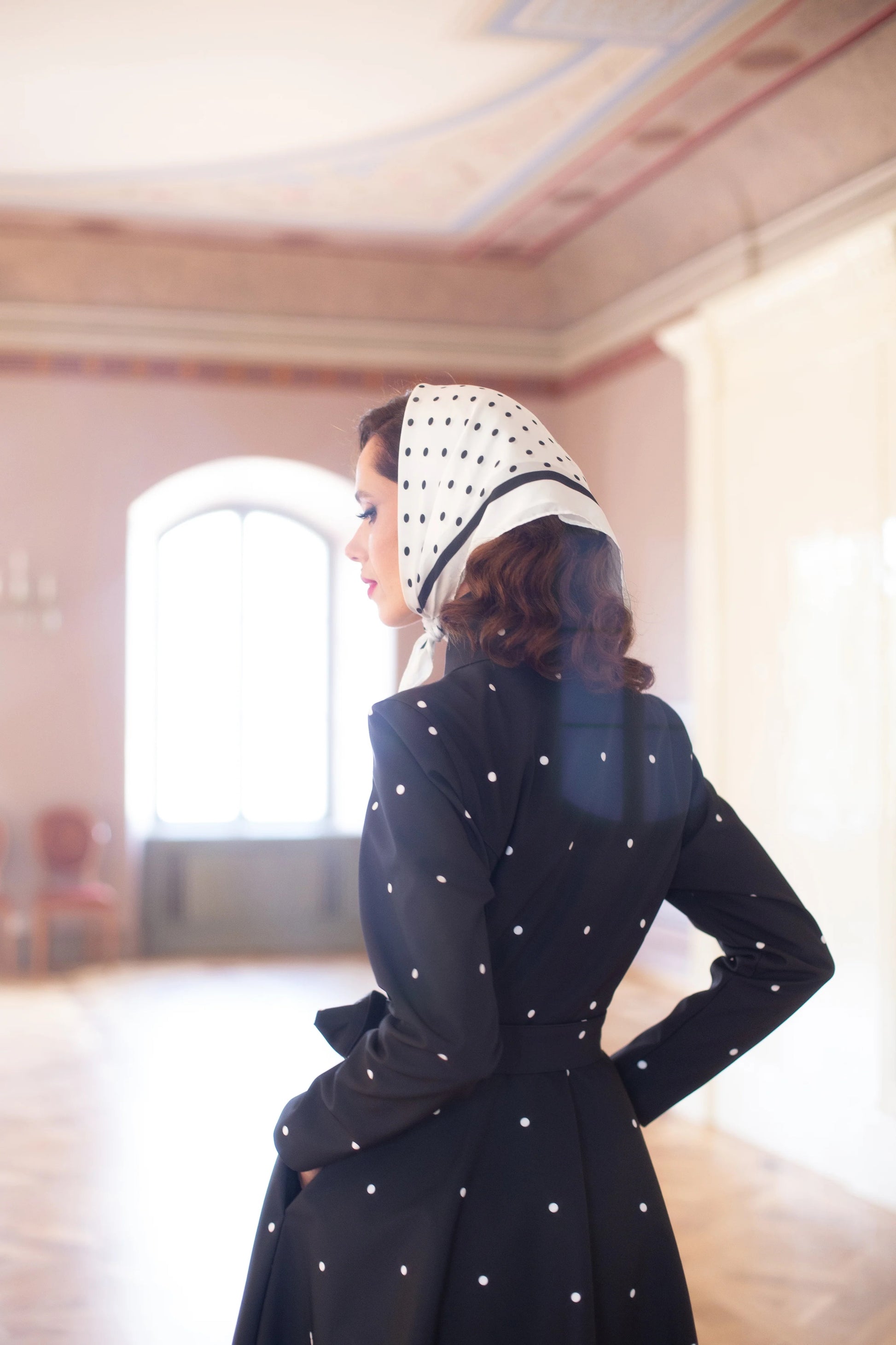 Hev din garderobe med denne stilige sorte kåpen, prydet med morsomme hvite prikker som gir et lekent preg på det klassiske uttrykket. Kåpen har en kroppsnær fasong som fremhever figuren din, mens det utsvingte A-linjeskjørtet gir en elegant og flytende bevegelse. Inni finner du luksuriøst svart italiensk satengfôr som gir en glatt følelse mot huden, og den avtakbare, justerbare hetten gir fleksibel beskyttelse for alle værforhold. Denne kåpen kombinerer tidløs eleganse med moderne detaljer, perfekt for enhver anledning slik at du skiller deg ut med stil og positivt fortegn.